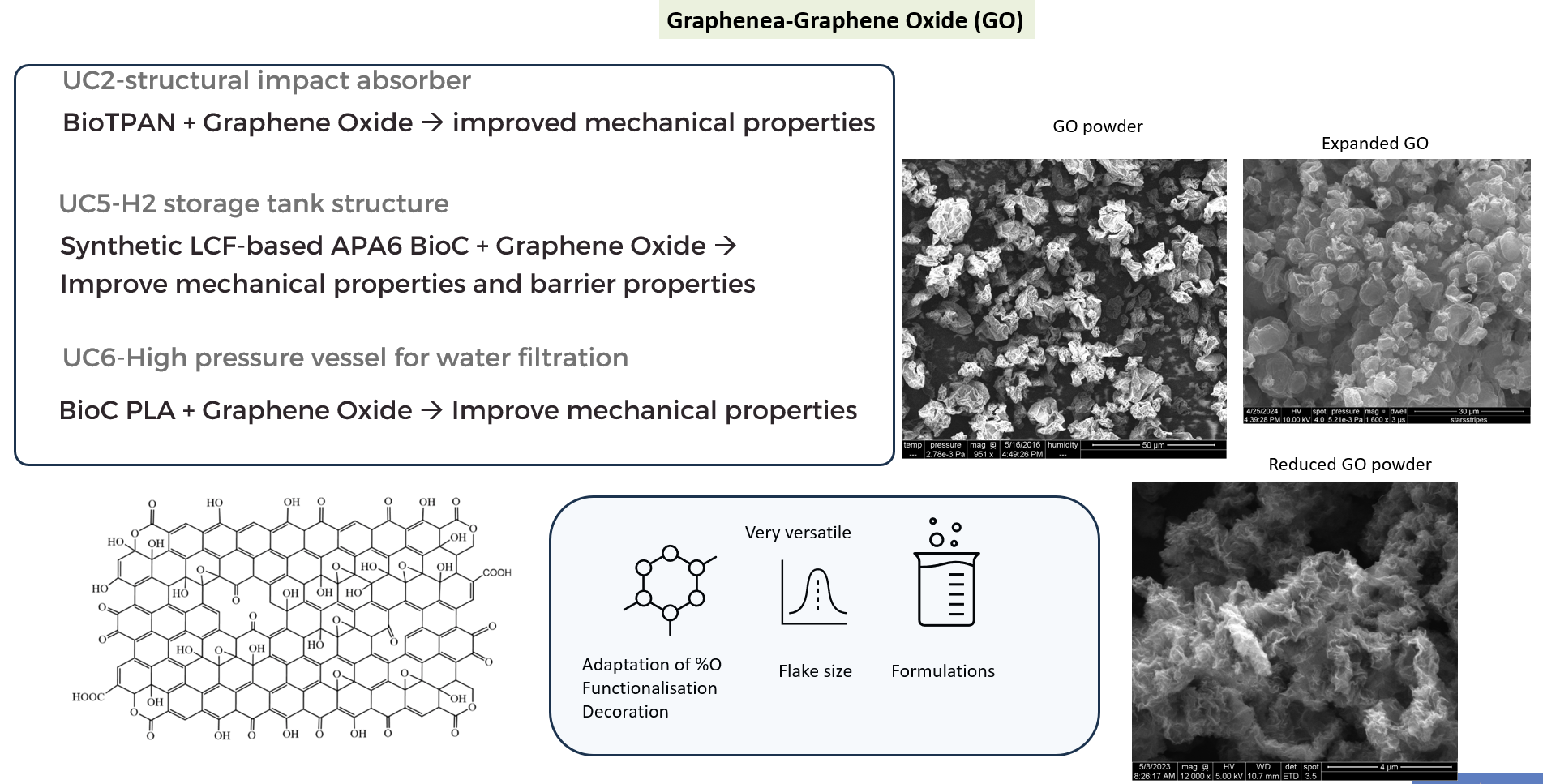 In WP3, GRA will develop specific graphene oxide materials to be added in the Bio-polymer matrixed to enhance the properties both mechanical and barrier to gases. In addition, formulations with the developed materials will be also carried out.